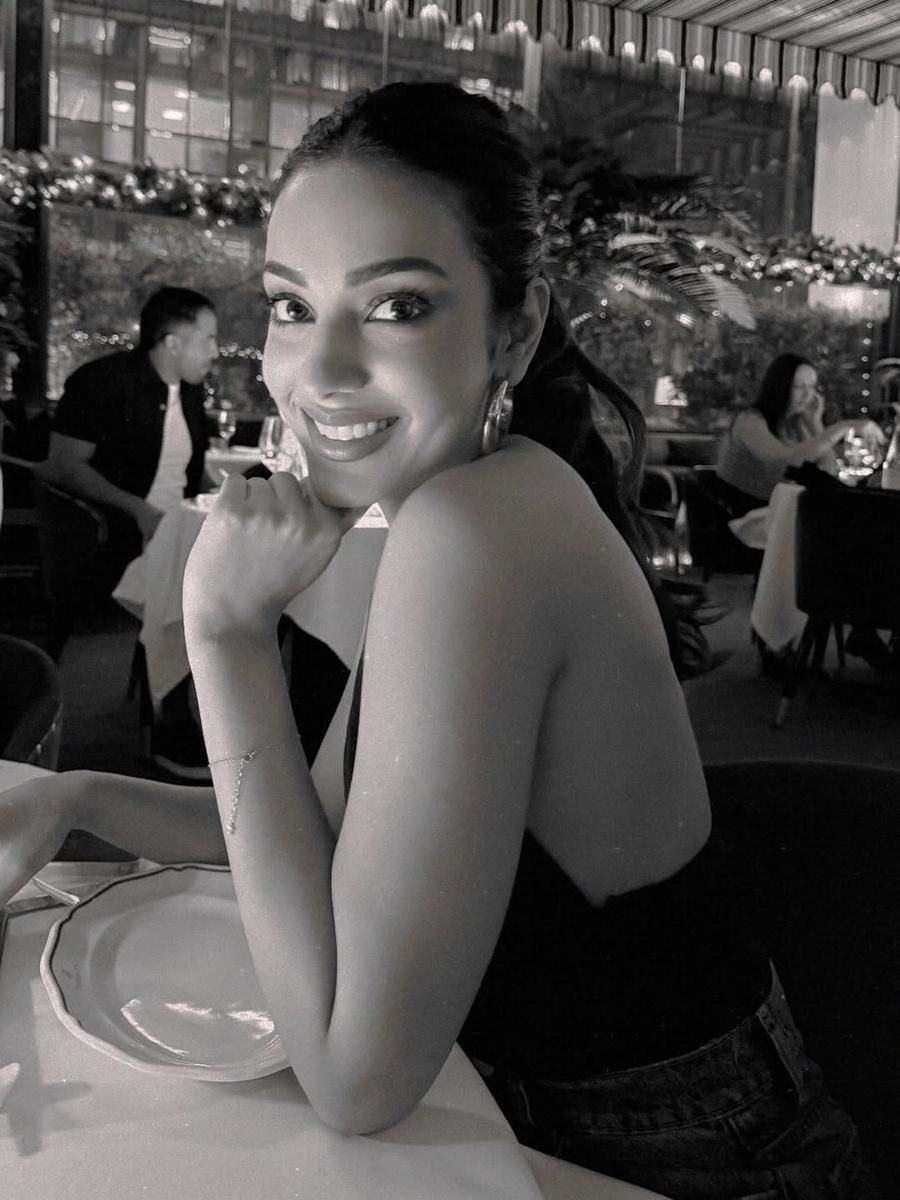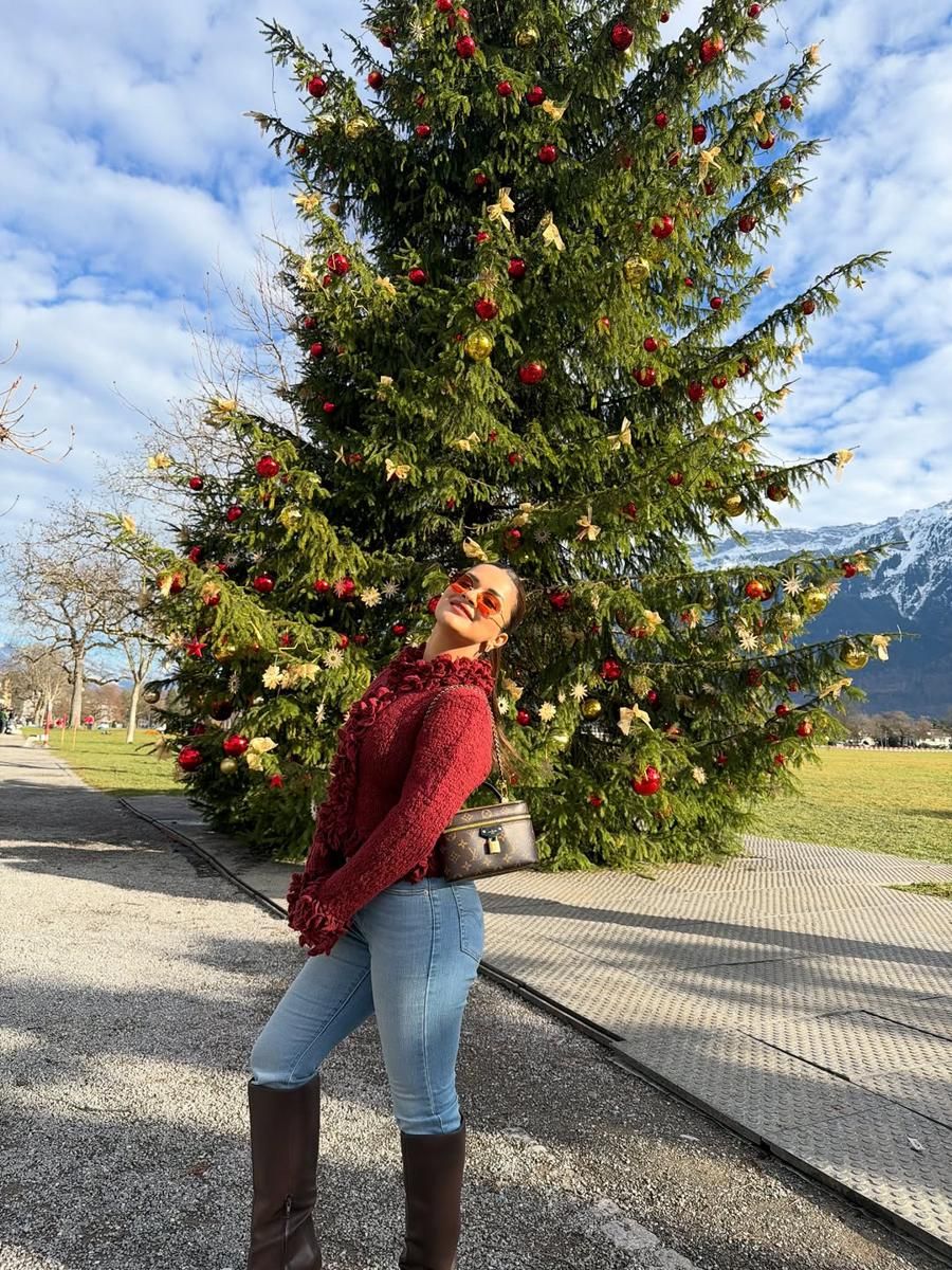 Rasha Thadani, yang beragama Hindu, tampak sangat bahagia saat berfoto dengan pohon Natal. Ia menunjukkan antusiasme dalam merayakan Natal.